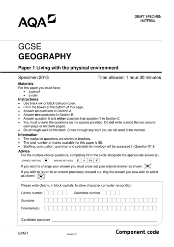 It is designed as a mock exam and is done in the style of the sample papers provided as part of the new AQA GCSE specification. Paper 1 Living with the physical environment. Summer 2018 Improve exam skills check understanding and familiarise students with the types of questions they will face in AQA GCSE 9-1 Geography.